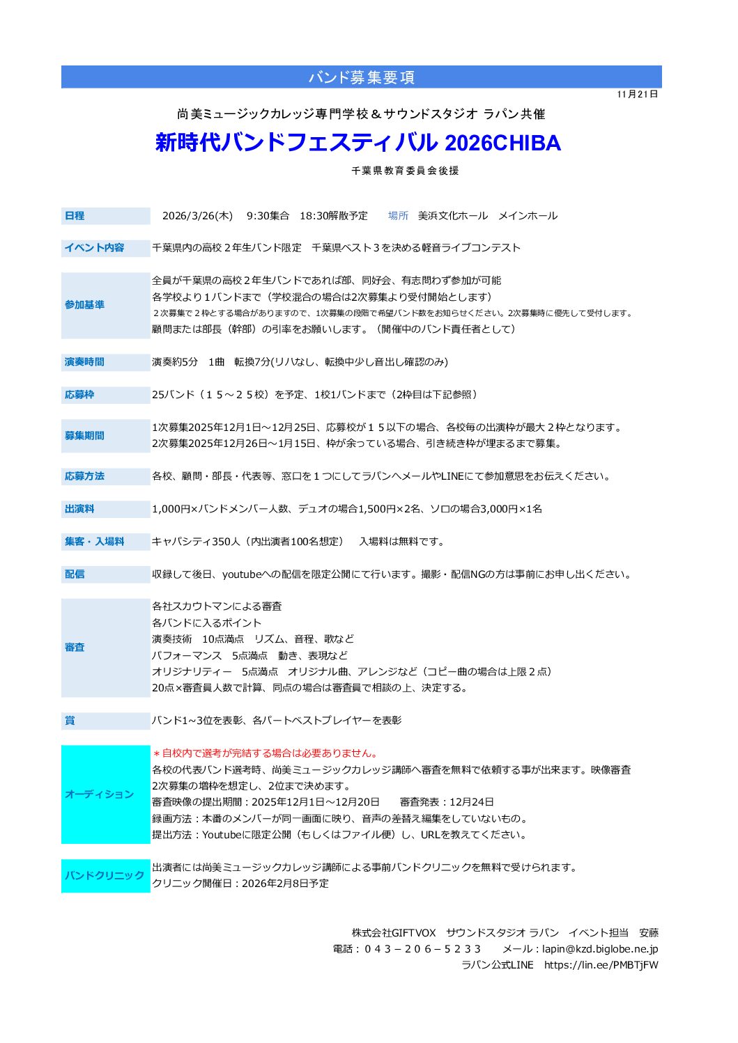 30バンド1曲ずつの演奏、審査結果の発表は18時頃となります。